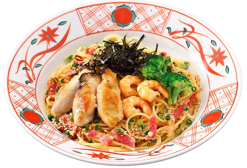 帆立と海老と湯葉のペペロンチーノ 京風だし仕立て